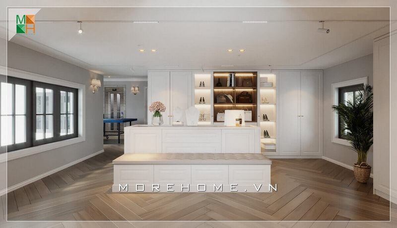 Một hệ thống kệ để đồ và tủ quần áo hiện đại trong không gian lớn của biệt thự, nhà phố tinh tế với sắc trắng trẻ trung, lại tiện lợi khi kết hợp với kính như một không gian trưng bày.