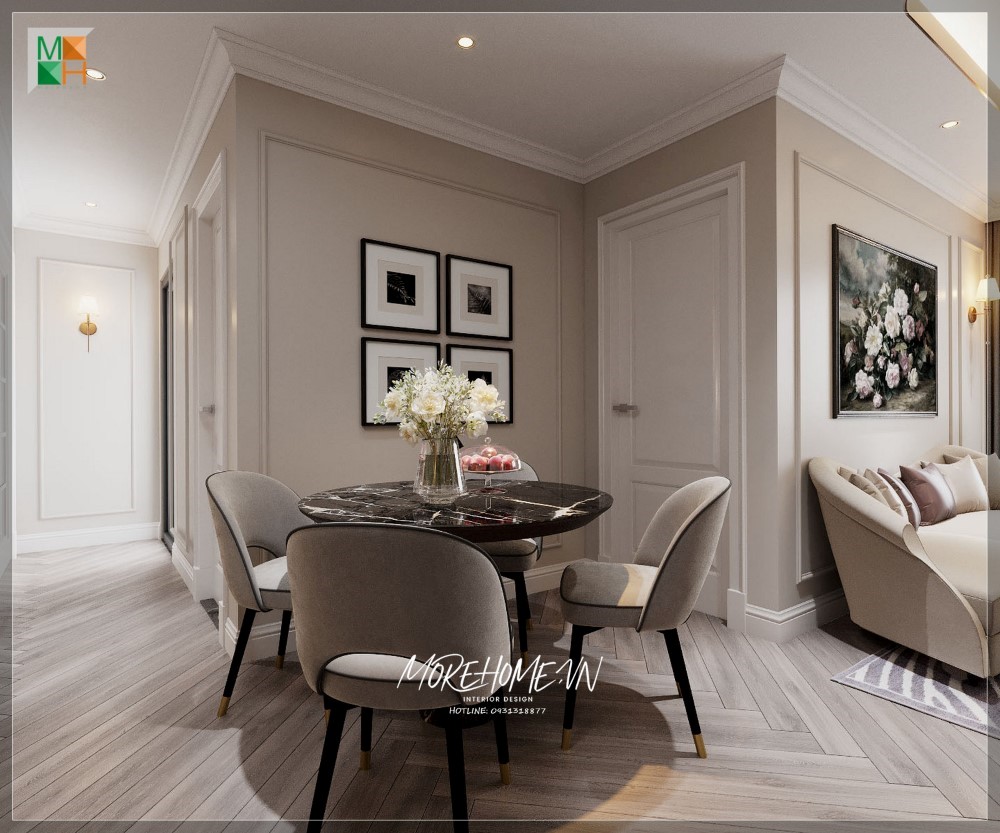 Trong bố trí nội thất phòng ăn biệt thự theo xu hướng hiện đại, sự xuất hiện của đèn không chỉ để chiếu sáng mà còn có hiệu ứng thị giác kích thích sự thích thú mỗi khi các thành viên sum vầy. Trong đây kts Morehome đã sử dụng ý tưởng dùng đèn chiếu sáng dạng lục giác với 6 đỉnh tựa như bông hoa đang bung nở khoe sắc, và sẽ đẹp hơn nếu thể hiện đúng thời điểm, và hiển nhiên trong mỗi tổ ấm ngày nay, trong 1 ngày làm việc bận rộn thì bữa tối lại là bữa chính và quan trọng nhất để nghệ thuật ánh sáng được phát huy tác dụng của mình.