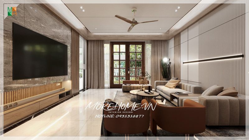 Để tạo cảm giác mát mẻ cho không gian căn phòng, các gia chủ đã lựa chọn hình thức ốp tường bằng đá có màu sắc trung tính, không quá tối mà cũng không quá sáng.